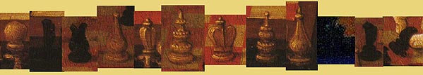 The game in the foreground turns out to be no mere prop, but an instructive presentation of the game itself. Studying the picture carefully, we see that each piece is deliberately represented, some more than once, and some at various angles. After analyzing the position and the identities of the pieces, and comparing the various renditions of each piece, we have selected a representative of each one, imagined it as a whole piece, defined what its form and measurements must have been – and finally reconstructed it as faithfully as possible. The result is a chess set so true to the painting that one can imagine the painting was made from these very pieces. One can step right into the painting and play the game. The pieces in the painting:sketches defining the forms:
